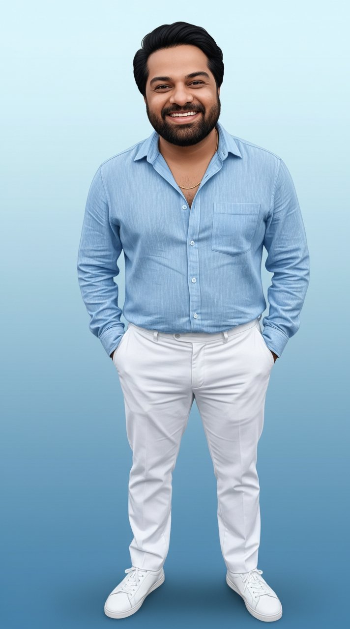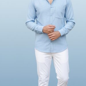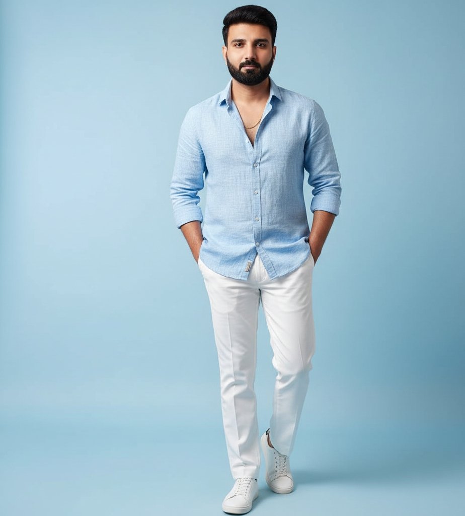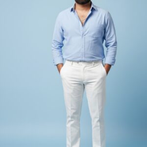 This striking portrait captures a stylish young man with a confident and modern vibe. He wears a light blue shirt and crisp white trousers, with every fabric detail rendered in perfect clarity. The soft, pastel blue background makes his figure pop, highlighting the natural textures and flawless lighting. This image embodies contemporary elegance and is ideal for fashion inspiration, professional branding, or as a sophisticated piece of digital art.