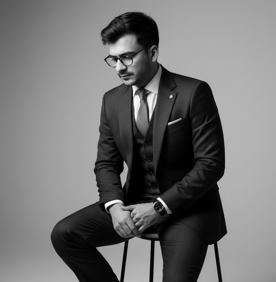 A striking black and white portrait of a man in a sophisticated suit, captured in a moment of quiet thought. His slightly hunched posture and downward gaze create a powerful, emotional mood. The clean studio lighting highlights the sharp details of his suit and glasses, giving the image a high-fashion, editorial feel. This ultra-HD artistic portrait is perfect for fashion portfolios, artistic projects, or modern decor.
